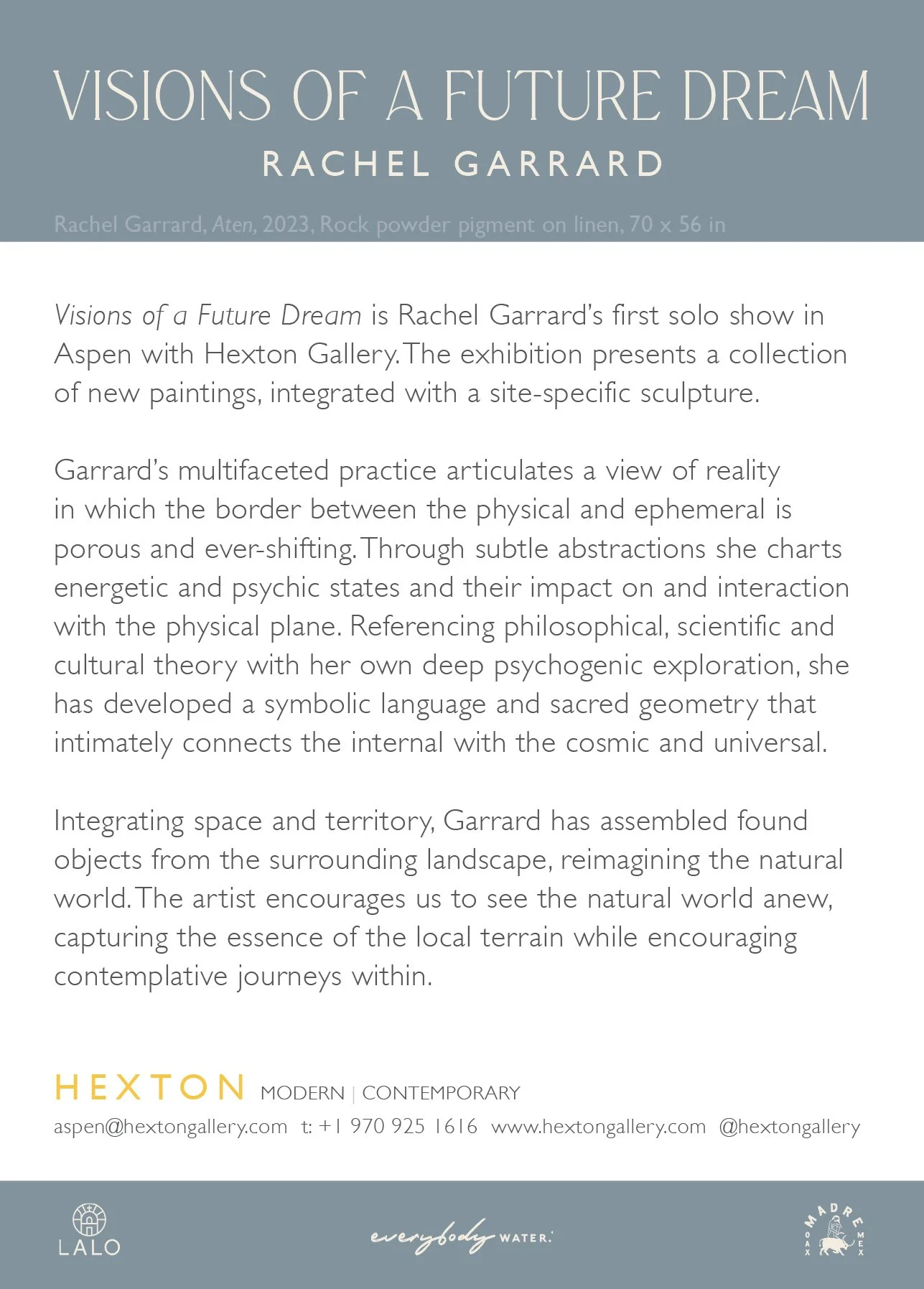 My approach to designing the exhibition materials for Garrard’s show was to create an ethereal and meditative experience, similar to how one would experience the show in-person. The process included a selection of fonts, print design, copywriting, and color choices.